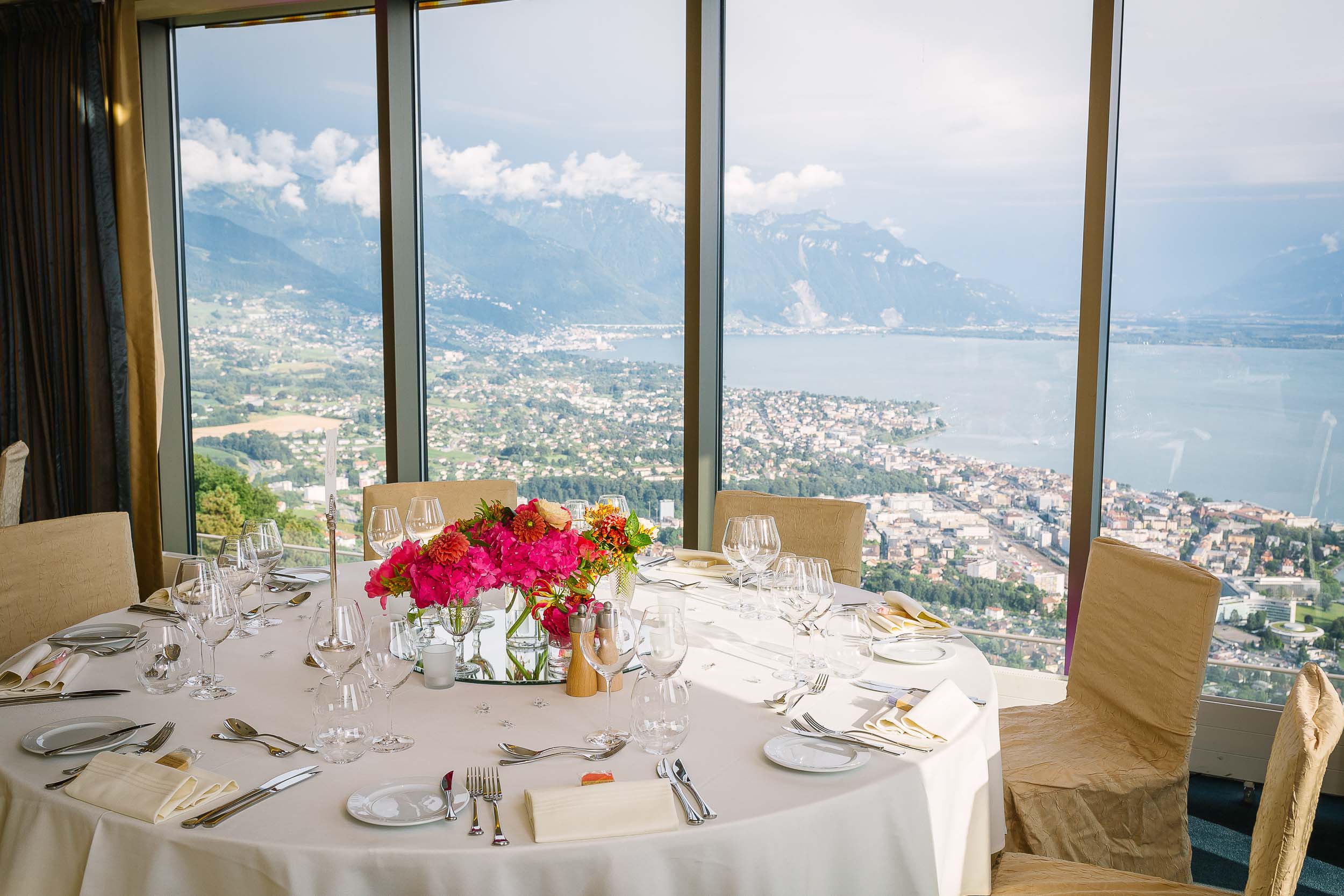 Katherine had arranged an outdoor apéro at La Burritaz with children’s entertainment and a playground. After an introduction by the alpenhorns, there were speeches of thanks and jumping of puddles before an afternoon of catching up. I think it is such a good idea to have speeches at the apèro when everyone is still fresh. It also leaves the evening open to more intimate conversations and an opportunity for the bride and groom to make the rounds of the tables.
