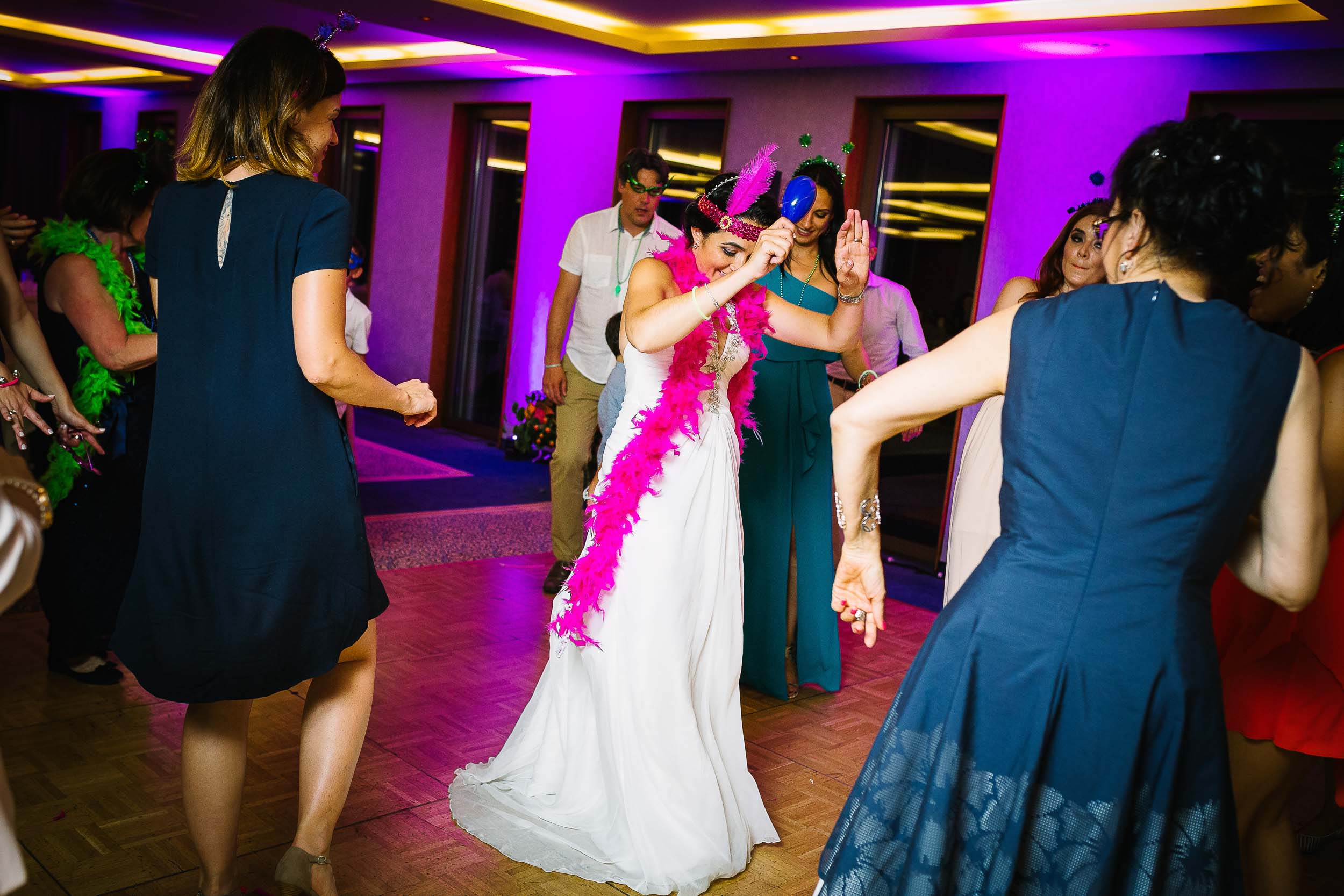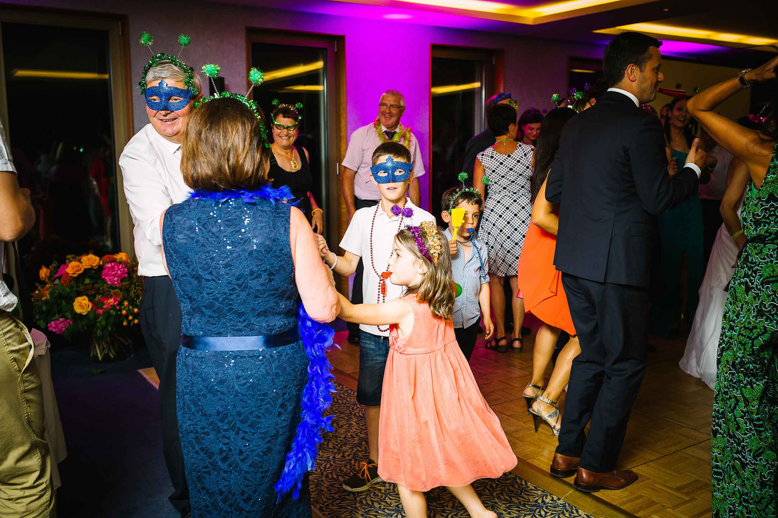 It can be challenging to get fabulous wedding party photos. Sometimes the restrictions of the venue work against photographs. This is especially true when they turn all the lights off! Katherine and Samuel had a box of carnival accessories which made for wonderfully colourful pictures. The chance to play in front of the camera also encouraged more of the guests to get involved, and I think that including the kids helped everyone to embrace the fun.